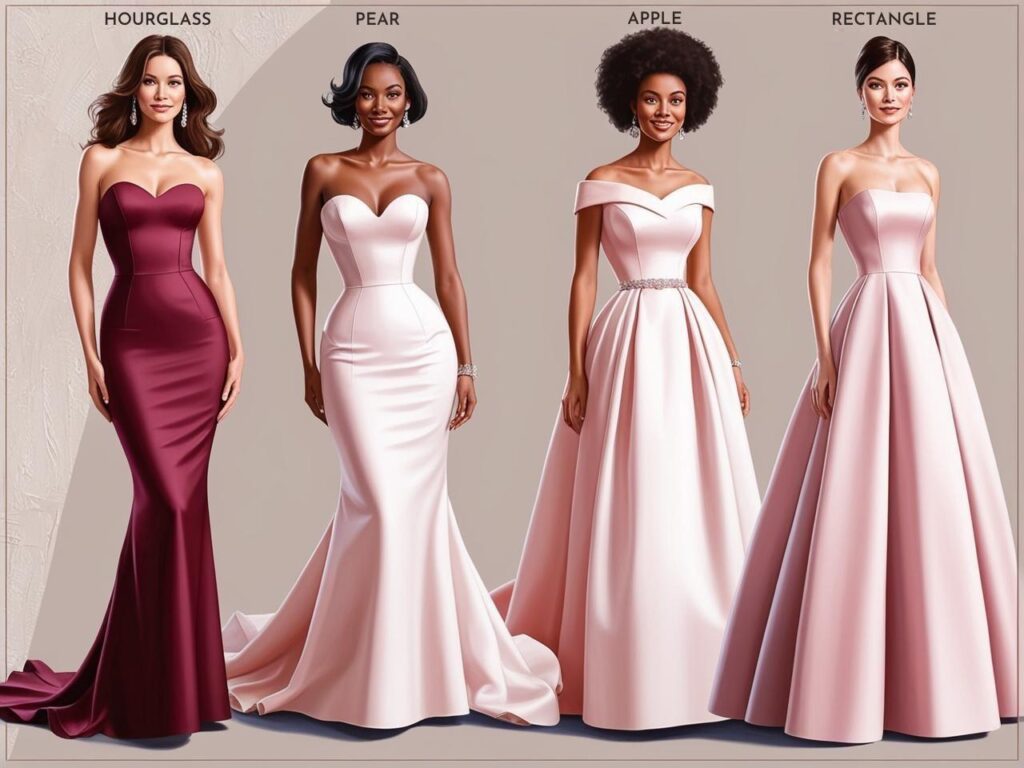 Knowing your body shape is essential for choosing a dress that flatters and enhances your natural curves. Here’s a breakdown of common body types and the silhouettes that work best for each: